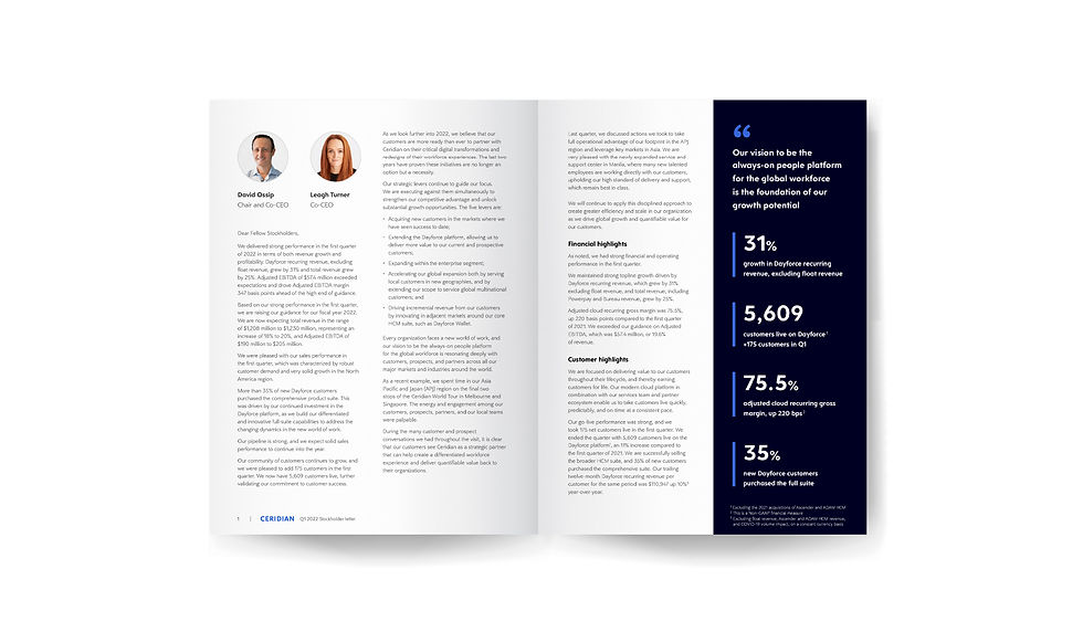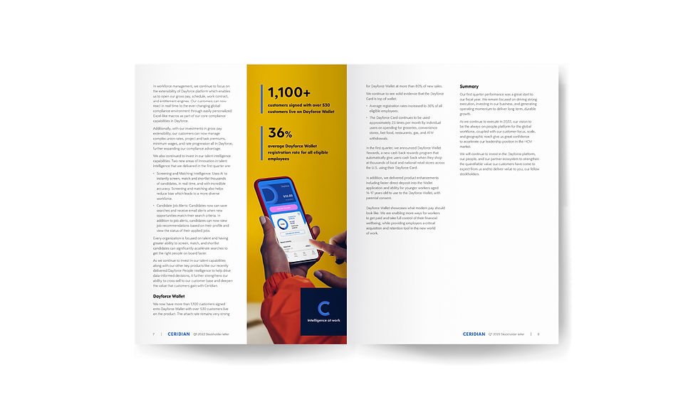 A highly sensitive quarterly report which covers company updates, customer wins, and financial performance. The covers for this year’s shareholder letters were designed as a highly abstract, unified set. A two-column layout and tables were utilized to organize the information while simplifying the type-heavy report to create a clean document that was detailed yet easy to digest at a glance.